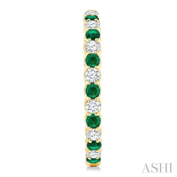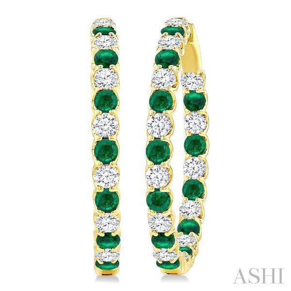 2.9 MM Round Emerald and 2 5/8 Ctw Round Cut Diamond Inside & Outside Alternating Precious Hoop Earrings in 14K Yellow Gold Image 3 Becker's Jewelers Burlington, IA