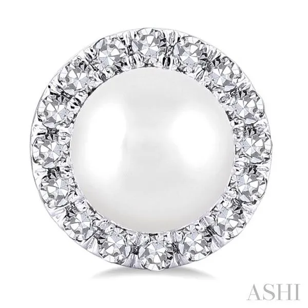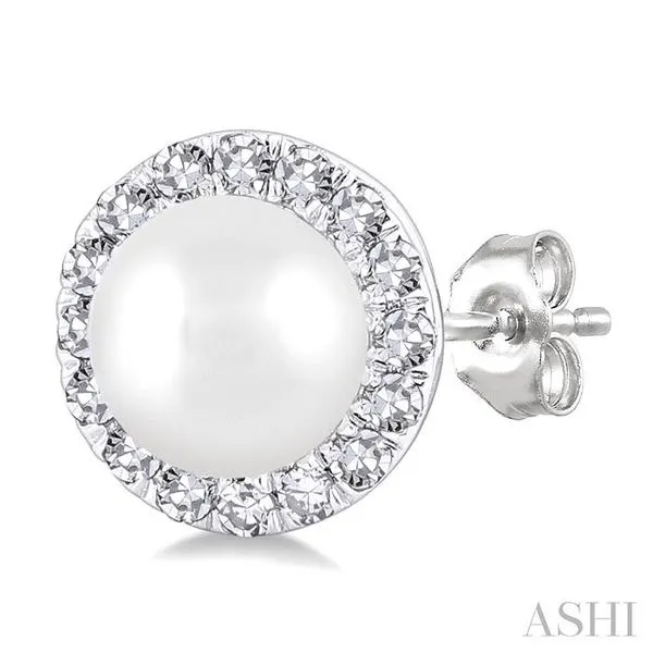 (319) 752-31964.5 MM White Cultured Pearl and 1/8 Ctw Round Cut Diamond Halo Stud Earrings in 14K White Gold