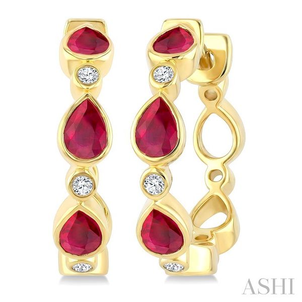 4X3 MM Pear Shape Ruby and 1/20 Ctw Bezel Set Round Cut Diamond Fashion Hoop Earrings in 10K Yellow Gold Image 2 Becker's Jewelers Burlington, IA