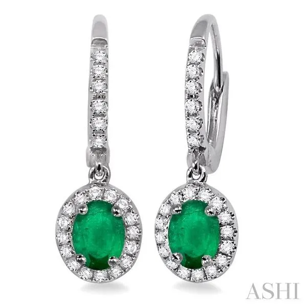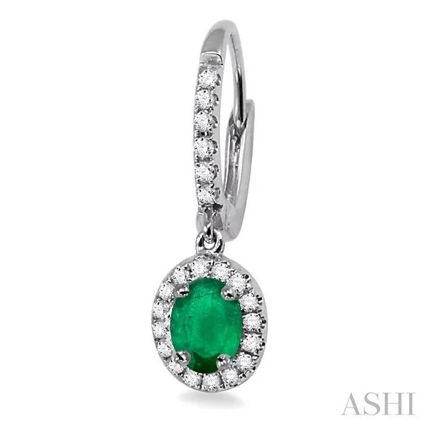 (319) 752-31965x3 MM Oval Cut Emerald and 1/4 Ctw Round Cut Diamond Earrings in 14K White Gold