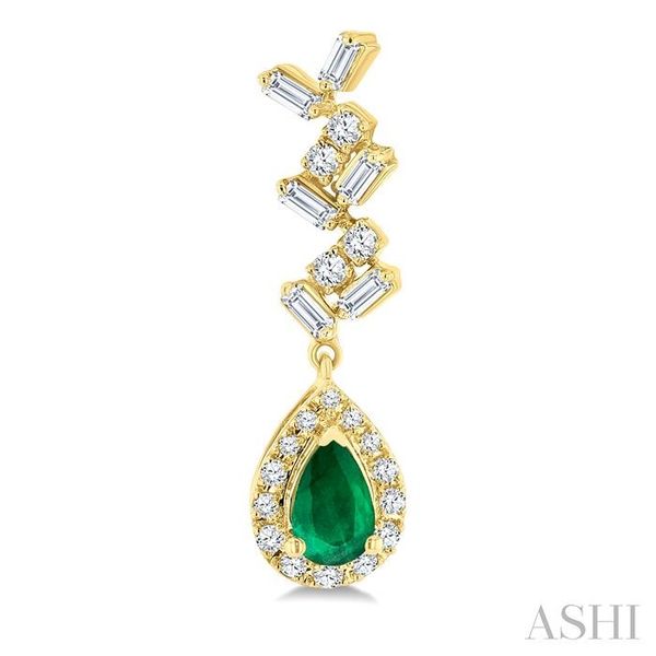 5x3 MM Pear Shape Emerald, 1/3 Ctw Baguette and Round Cut Diamond Halo Precious Earrings in 10K Yellow Gold Image 2 Becker's Jewelers Burlington, IA