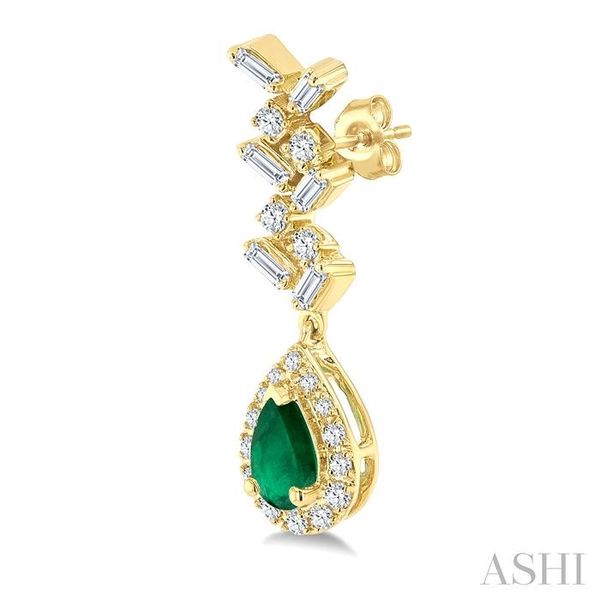 5x3 MM Pear Shape Emerald, 1/3 Ctw Baguette and Round Cut Diamond Halo Precious Earrings in 10K Yellow Gold Image 3 Becker's Jewelers Burlington, IA