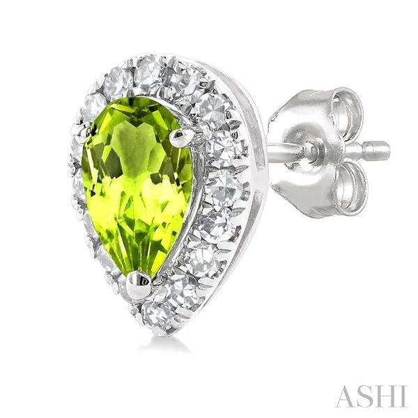 (319) 752-31965x3 MM Pear Shape Peridot and 1/8 Ctw Single Cut Diamond Halo Semi-Precious Stud Earrings in 10K White Gold