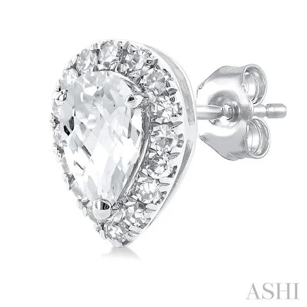 (319) 752-31965x3 MM Pear Shape White Topaz and 1/8 Ctw Single Cut Diamond Halo Semi-Precious Stud Earrings in 14K White Gold