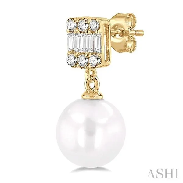 (319) 752-31966 MM Cultured Pearls and 1/10 Ctw Baguette and Single Cut Diamond Earrings in 10K Yellow Gold