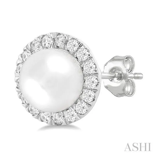 (319) 752-31966 MM White Cultured Pearl and 1/4 Ctw Round Cut Diamond Halo Stud Earrings in 14K White Gold
