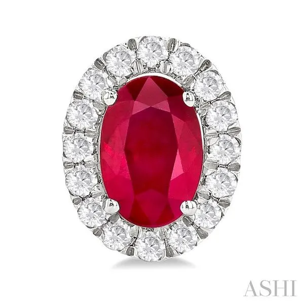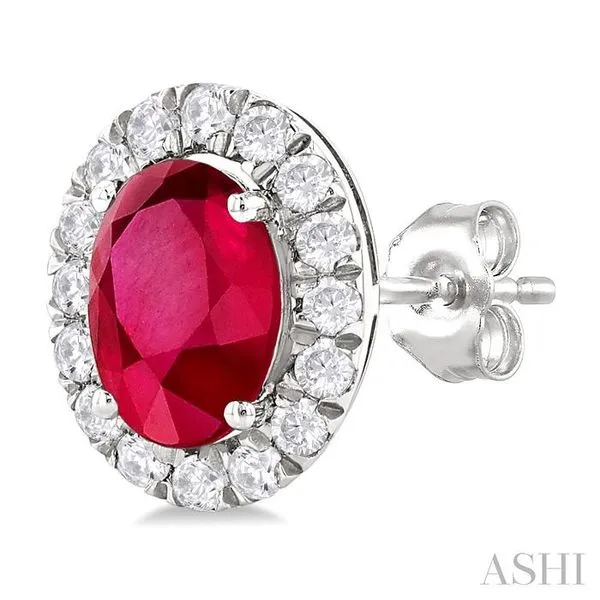 (319) 752-31966x4 MM Oval Shape Ruby and 1/4 Ctw Round Cut Diamond Halo Precious Stud Earrings in 14K White Gold