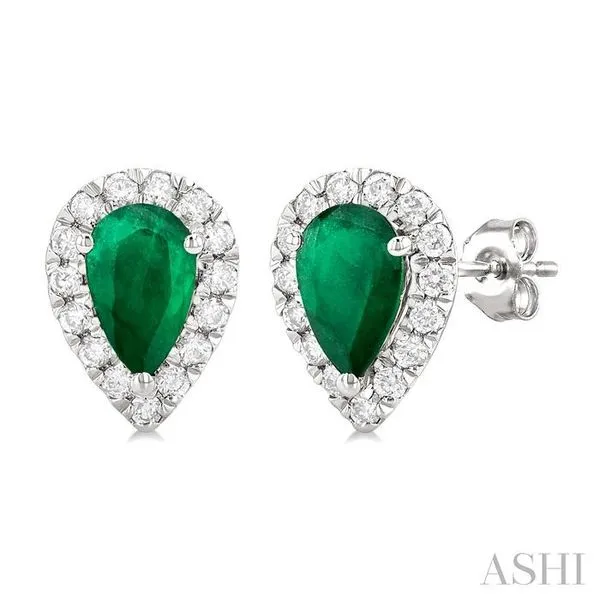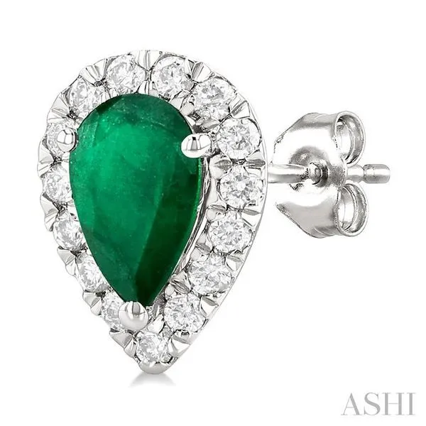 (319) 752-31966x4 MM Pear Shape Emerald and 1/4 Ctw Round Cut Diamond Halo Precious Stud Earrings in 14K White Gold