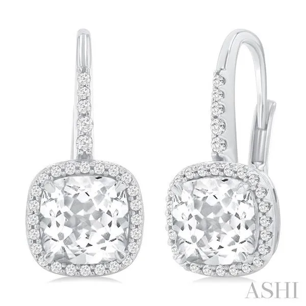 (319) 752-31967X7 MM Cushion Cut White Topaz and 1/4 Ctw Round Cut Diamond Halo Semi-Precious Earring in 14K White Gold