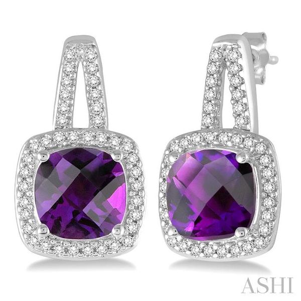 7x7 MM Cushion Shape Amethyst and 1/4 Ctw Round Cut Diamond Earrings in 10K White Gold Image 2 Becker's Jewelers Burlington, IA
