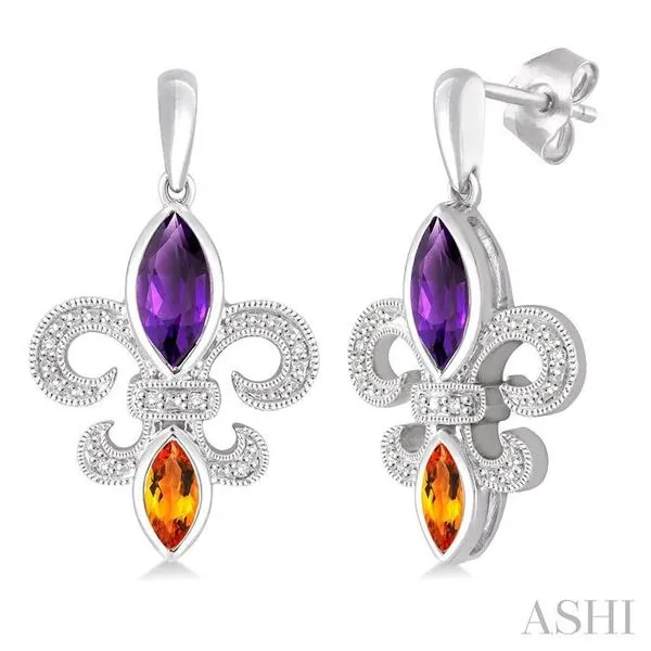 (319) 752-31968x4 MM Marquise Cut Amethyst, 6x3 MM Marquise Cut Citrine and 1/20 Ctw Round Cut Diamond Fleur De Lis Earrings in Sterling Silver