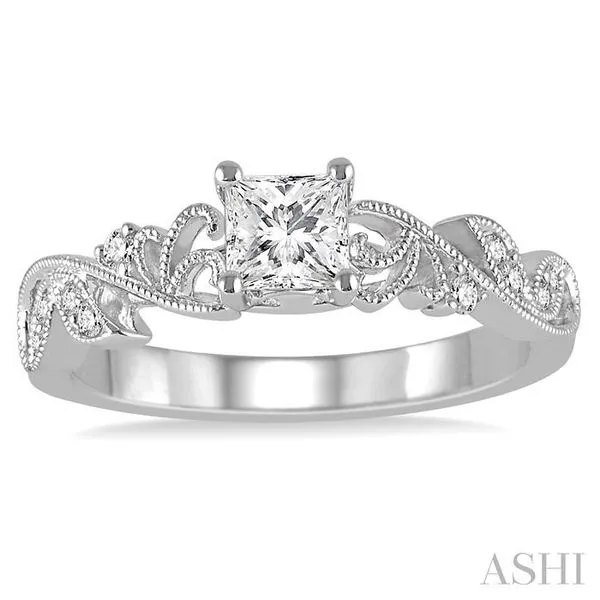 (319) 752-31961/10 Ctw Princess Cut Center Semi-Mount Diamond Leaf Motif Engagement Ring in 14K White Gold