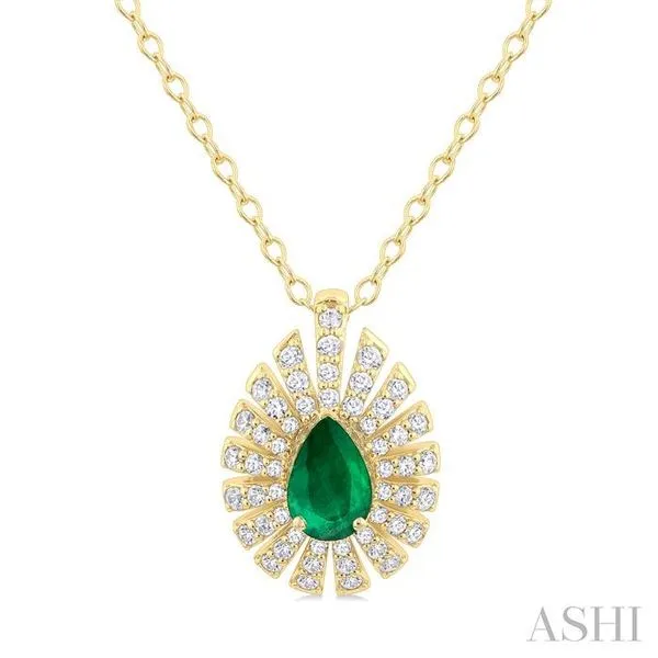 (319) 752-31961/3 Ctw Starburst 6X4MM Pear Cut Emerald and Round Cut Diamond Precious Pendant With Chain in 14K Yellow Gold