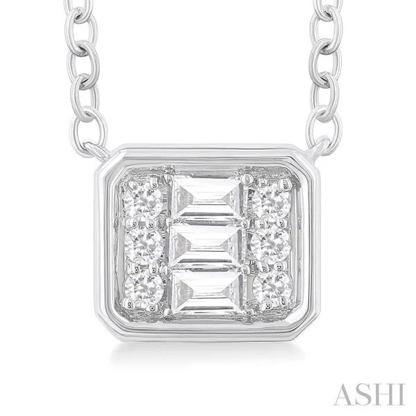 (319) 752-31961/6 Ctw Petite Bezel Set East-West Emerald Shape Fusion Baguette and Round Cut Diamond Fashion Pendant With Chain in 10K White Gold