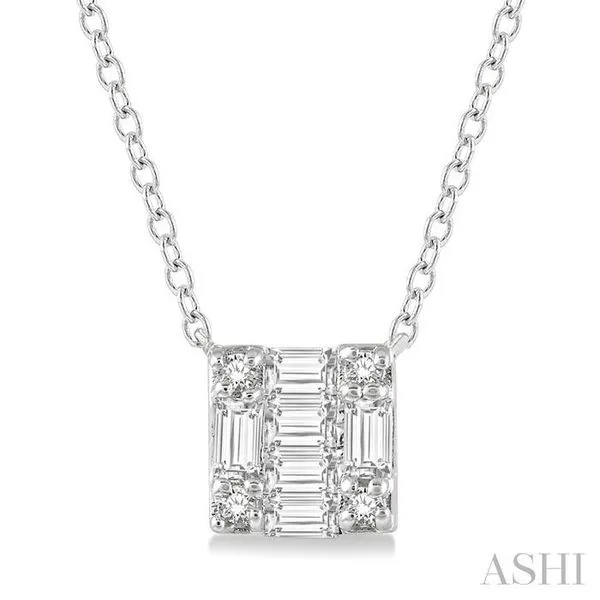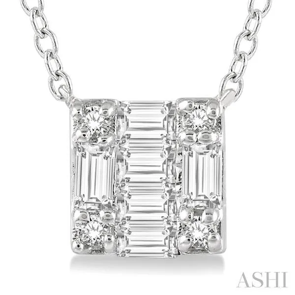 (319) 752-31961/8 Ctw Square Shape Baguette and Round Cut Diamond Petite Fashion Pendant With Chain in 10K White Gold