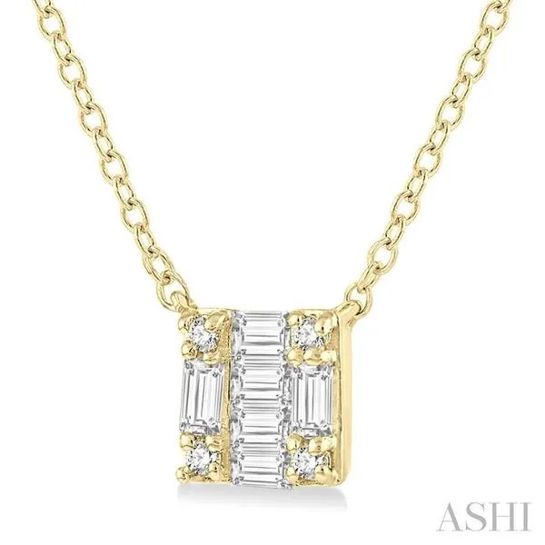 (319) 752-31961/8 Ctw Square Shape Baguette and Round Cut Diamond Petite Fashion Pendant With Chain in 10K Yellow Gold