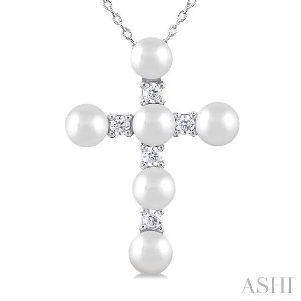 (319) 752-31964 MM Cross Cultured Pearl and 1/6 Ctw Round Cut Diamond Fashion Pendant With Chain in 10K White Gold