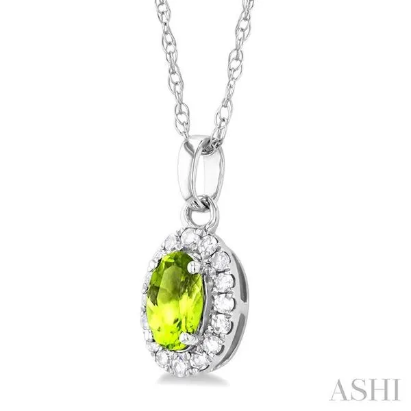 (319) 752-31965x3 MM Oval Shape Peridot and 1/20 Ctw Single Cut Diamond Halo Semi-Precious Pendant with Chain in 14K White Gold