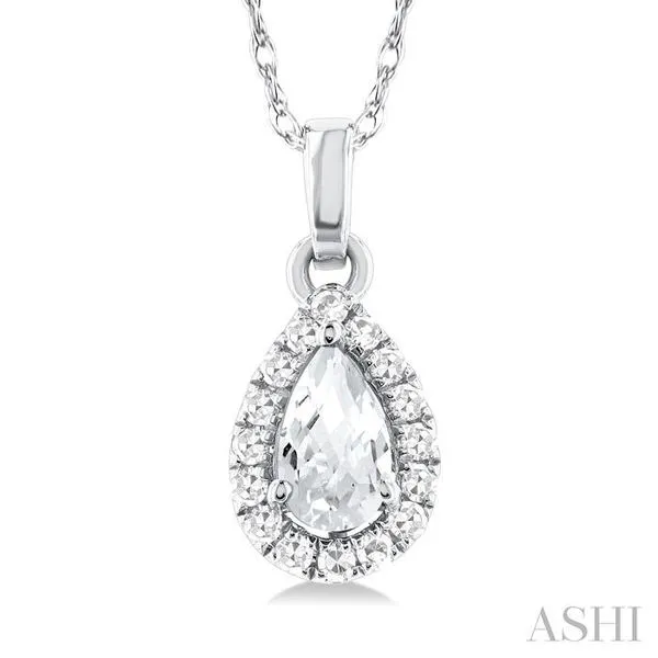 (319) 752-31965x3 MM Pear Shape White Topaz and 1/20 Ctw Single Cut Diamond Halo Semi-Precious Pendant with Chain in 14K White Gold