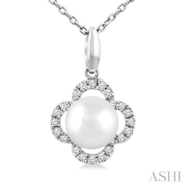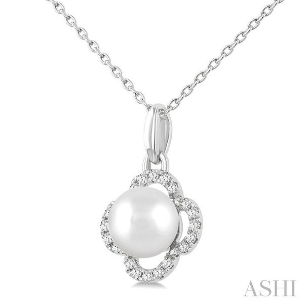 6 MM Cultured Pearl and 1/10 Ctw Round Cut Diamond Clover Petite Fashion Pendant With Chain in 10K White Gold Image 2 Becker's Jewelers Burlington, IA