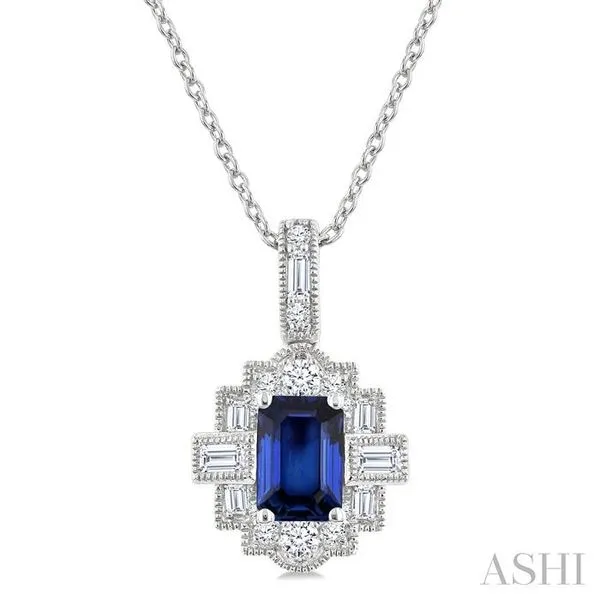 (319) 752-31966X4 MM Octagon Shape Sapphire and 1/4 Ctw Round and Baguette Cut Diamond Precious Pendant With Chain in 14K White Gold