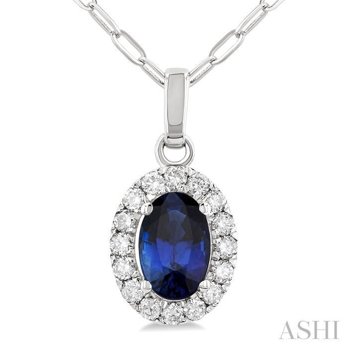 (319) 752-31966x4 MM Oval Shape Sapphire and 1/6 Ctw Round Cut Diamond Halo Precious Pendant with Chain in 14K White Gold