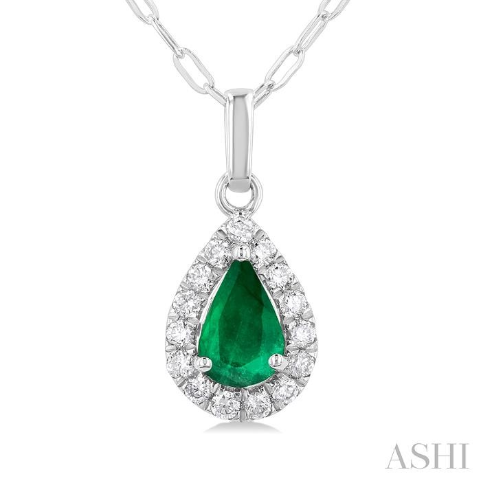 (319) 752-31966x4 MM Pear Shape Emerald and 1/6 Ctw Round Cut Diamond Halo Precious Pendant with Chain in 14K White Gold