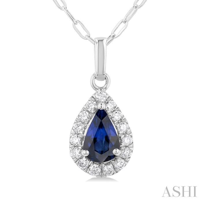 (319) 752-31966x4 MM Pear Shape Sapphire and 1/6 Ctw Round Cut Diamond Halo Precious Pendant with Chain in 14K White Gold
