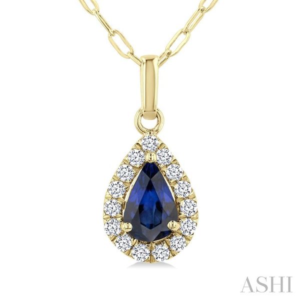 6x4 MM Pear Shape Sapphire and 1/6 Ctw Round Cut Diamond Halo Precious Pendant with Chain in 14K Yellow Gold Image 2 Becker's Jewelers Burlington, IA