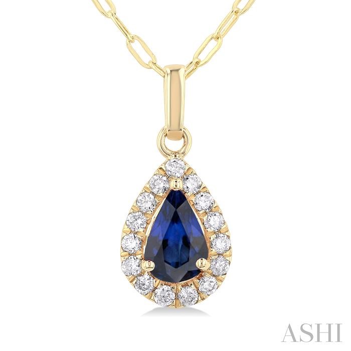 (319) 752-31966x4 MM Pear Shape Sapphire and 1/6 Ctw Round Cut Diamond Halo Precious Pendant with Chain in 14K Yellow Gold