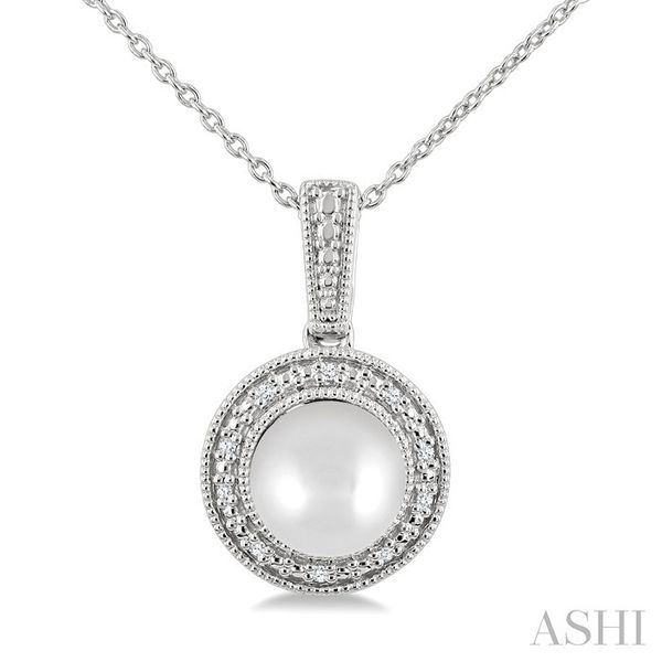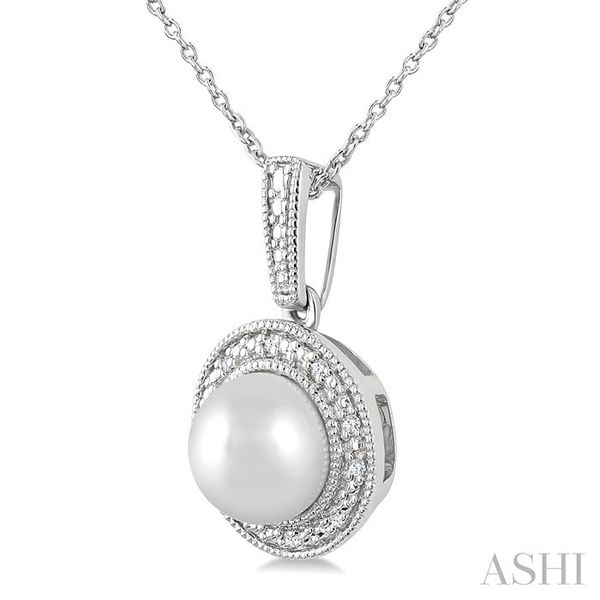 7 MM Cultured Pearl and 1/50 Ctw Round Cut Diamond Halo Pendant With Chain in Sterling Silver Image 3 Becker's Jewelers Burlington, IA