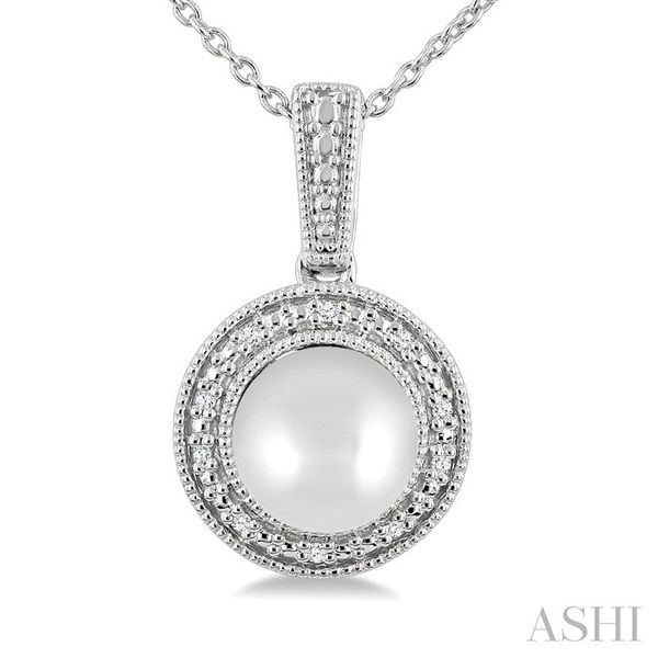 7 MM Cultured Pearl and 1/50 Ctw Round Cut Diamond Halo Pendant With Chain in Sterling Silver Image 2 Becker's Jewelers Burlington, IA