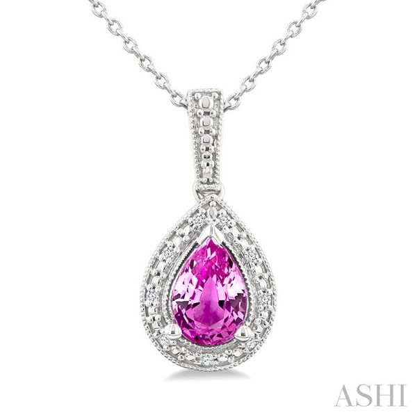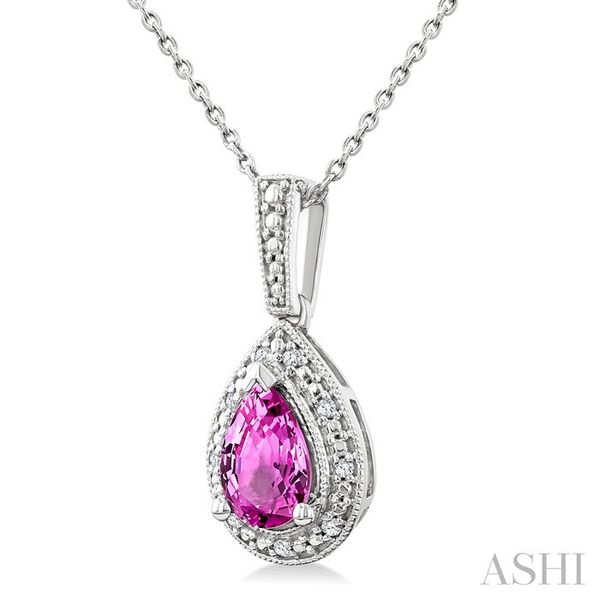 7X5 MM Pear Shape Lab-Created Pink Sapphire and 1/50 Ctw Round Cut Diamond Precious Pendant With Chain in Sterling Silver Image 3 Becker's Jewelers Burlington, IA
