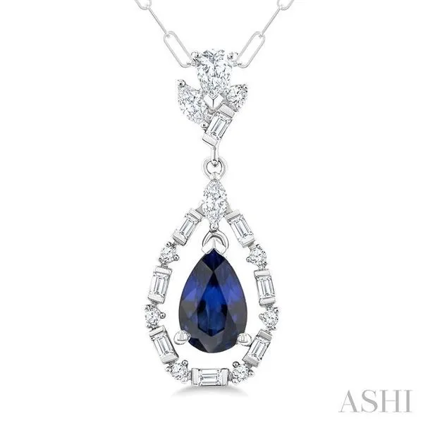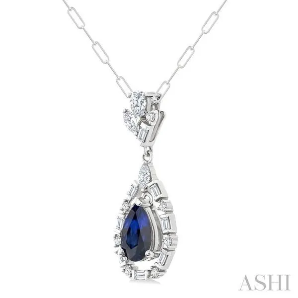 (319) 752-31967x5 MM Pear Shape Sapphire and 1/3 Ctw Mixed Cut Diamond Precious Dangle Pendant With Chain in 14K White Gold