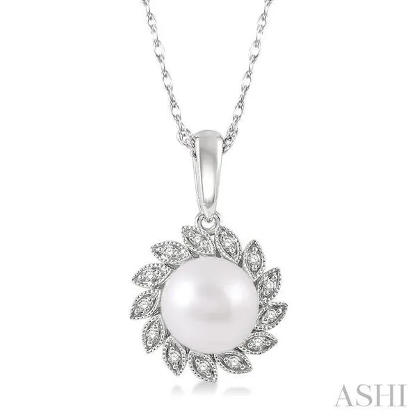 (319) 752-31967x7 MM Round Shape Cultured Pearl and 1/10 Ctw Sunflower Round Cut Diamond Pendant With Chain in 10K White Gold