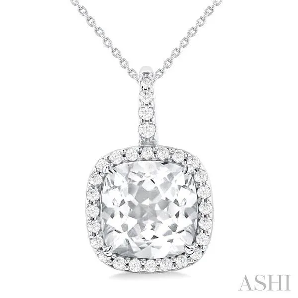 (319) 752-31969X9 MM Cushion Cut White Topaz and 1/4 Ctw Round Cut Diamond Semi-precious Pendant in 14K White Gold with Chain