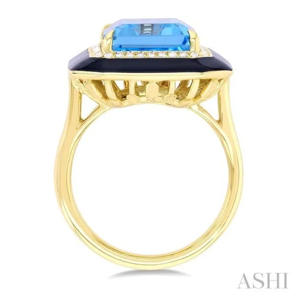 (319) 752-319614x10 MM Emerald Cut Blue Topaz and 1/5 Ctw Round Cut Diamond Halo & Black Enamel Border Semi-Precious Ring in 14K Yellow Gold