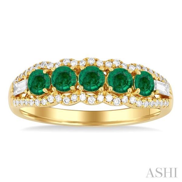 3.1 MM Round Emerald and 1/4 Ctw Baguette and Round Cut Diamond 5-Stone Precious Ring in 14K Yellow Gold Image 2 Becker's Jewelers Burlington, IA