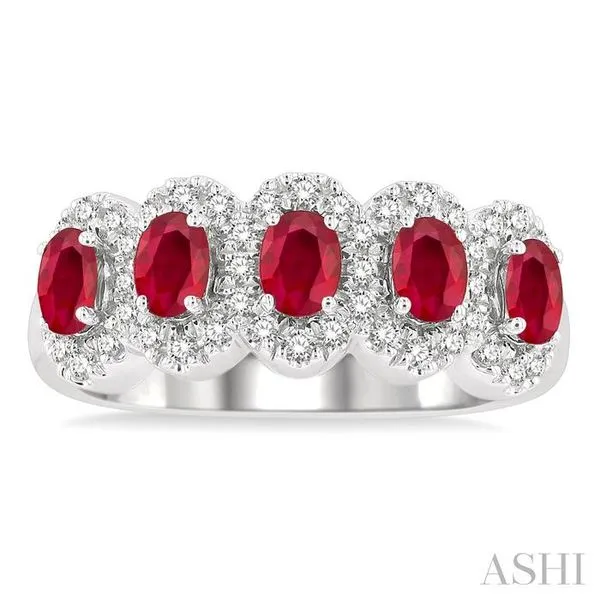 (319) 752-31964x3 MM Oval Cut Ruby and 1/3 Ctw Round Cut Diamond Precious Wedding Band in 14K White Gold