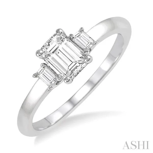 (319) 752-31965/8 Ctw Emerald and Baguette Diamond Engagement Ring with 1/2 Ct Emerald cut Center Stone in 14K White Gold
