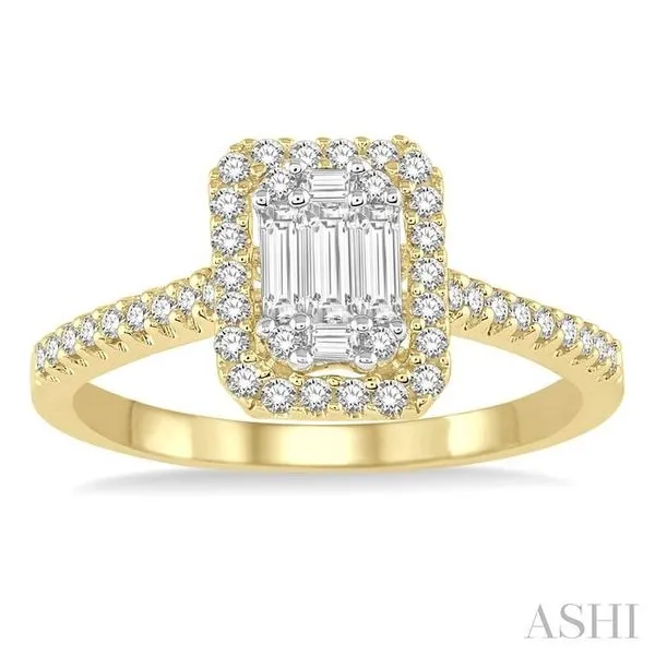 (319) 752-31965/8 Ctw Emerald Shape Baguette and Round Cut Diamond Ring in 14K Yellow and White Gold