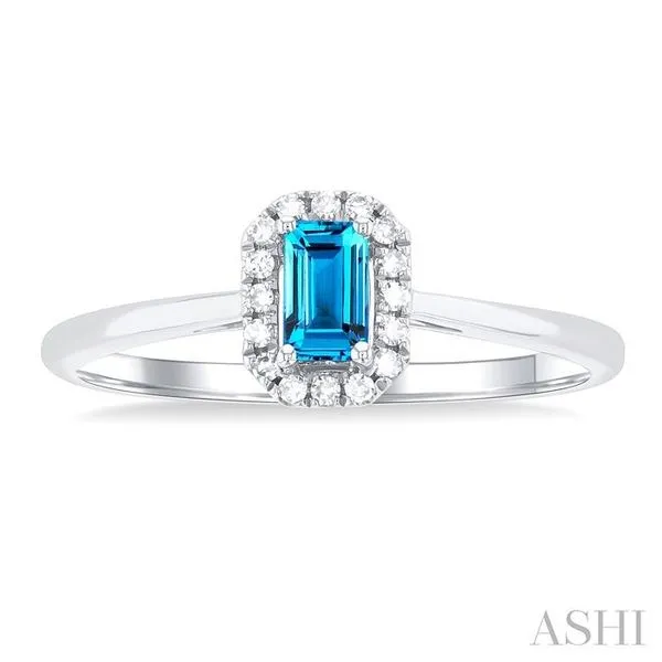 (319) 752-31965x3 MM Octagonal Shape Blue Topaz and 1/20 Ctw Single Cut Diamond Halo Semi-Precious Ring in 14K White Gold
