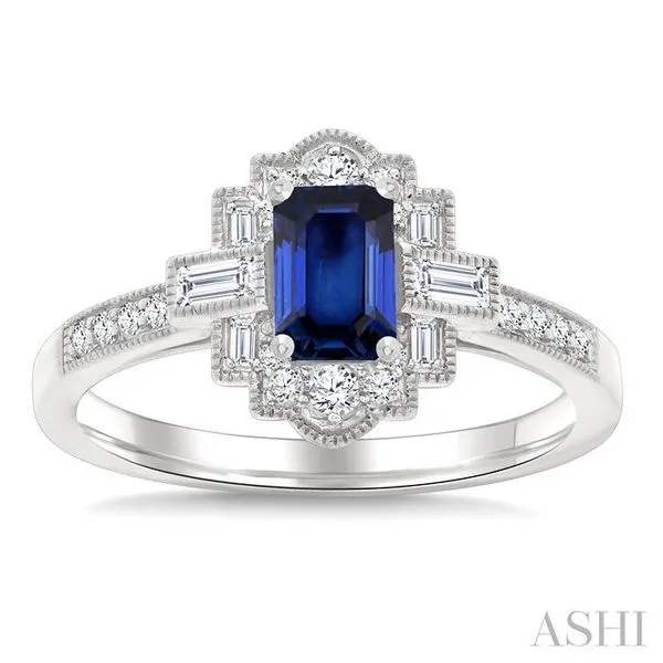 (319) 752-31966X4 MM Octagon Shape Sapphire and 1/3 Ctw Art Deco Mixed Cut Diamond Precious Fashion Ring in 14K White Gold