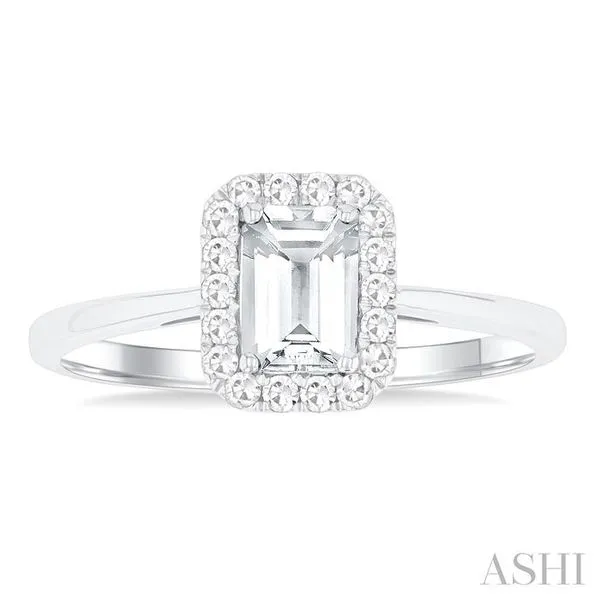 (319) 752-31966x4 MM Octagonal Shape White Topaz and 1/6 Ctw Round Cut Diamond Halo Semi-Precious Ring in 14K White Gold