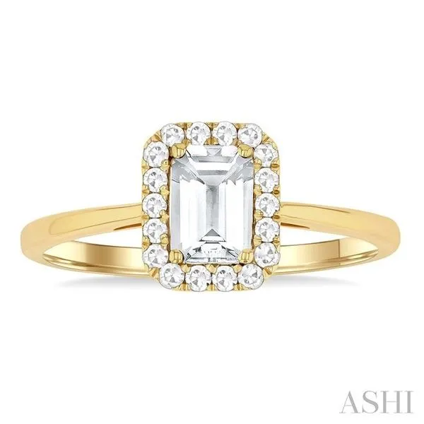 (319) 752-31966x4 MM Octagonal Shape White Topaz and 1/6 Ctw Round Cut Diamond Halo Semi-Precious Ring in 14K Yellow Gold