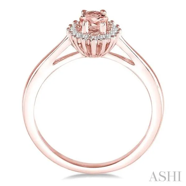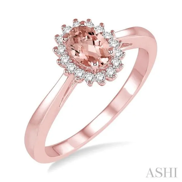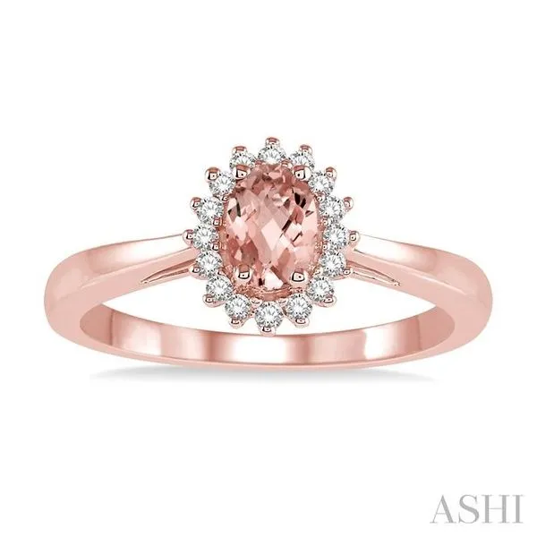 (319) 752-31966X4 MM Oval Cut Morganite Center and 1/8 Ctw Round Cut Diamond Halo Precious Stone Ring in 10K Rose Gold