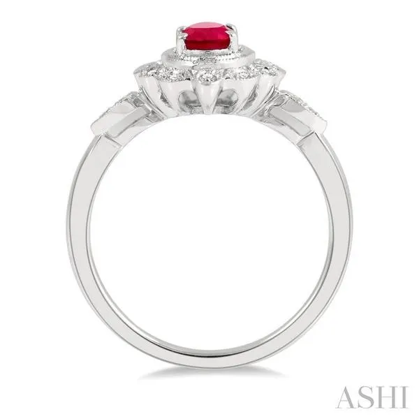 (319) 752-31966x4 MM Oval Cut Ruby and 1/8 Ctw Lattice Reverse Taper Shank Round Cut Diamond Precious Ring in 10K White Gold