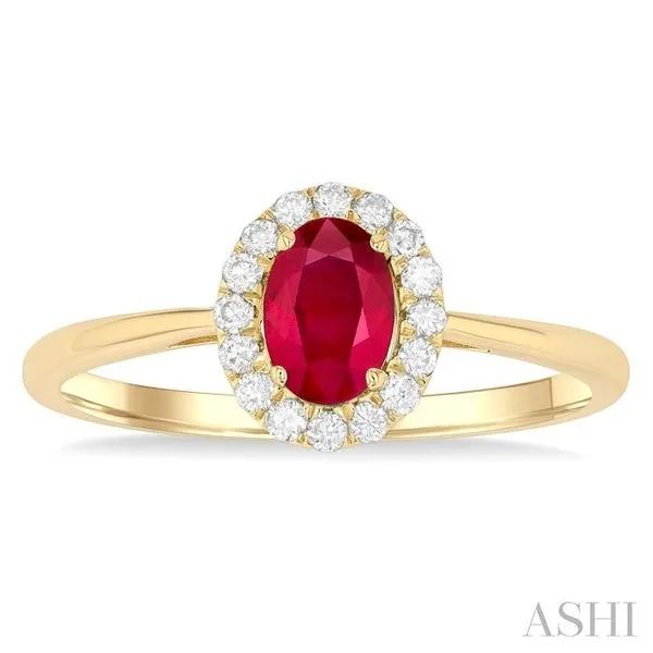 (319) 752-31966x4 MM Oval Shape Ruby and 1/6 Ctw Round Cut Diamond Halo Precious Ring in 14K Yellow Gold