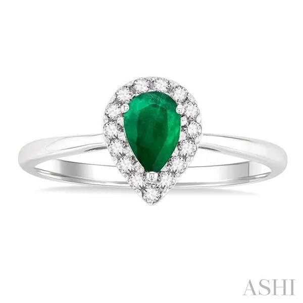 (319) 752-31966x4 MM Pear Shape Emerald and 1/6 Ctw Round Cut Diamond Halo Precious Ring in 14K White Gold