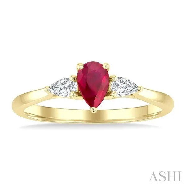 (319) 752-31966X4 MM Pear Shape Ruby and 1/5 Ctw Diamond 3-Stone Precious Ring in 14K Yellow Gold